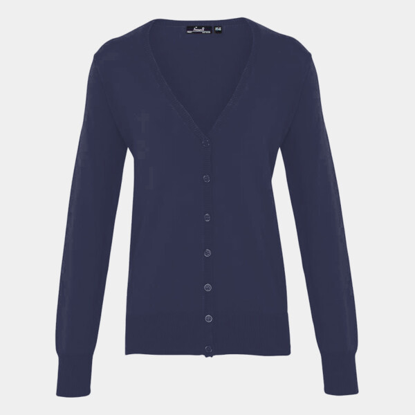 Women's long sleeve V-neck cardigan. Soft feel/Cotton rich yarn. Fine gauge knit. Button fastening. 7 button fastening. Contemporary styling. Set in sleeves. 40°C Domestic wash. Size 8, 10, 12, 14, 16, 18, 20, 22, 24