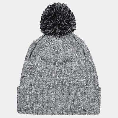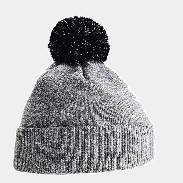Double layer knit. Dual Style - Cuffed or Slouch. Two-tone pom pom. Ribbed cuff. Size One Size