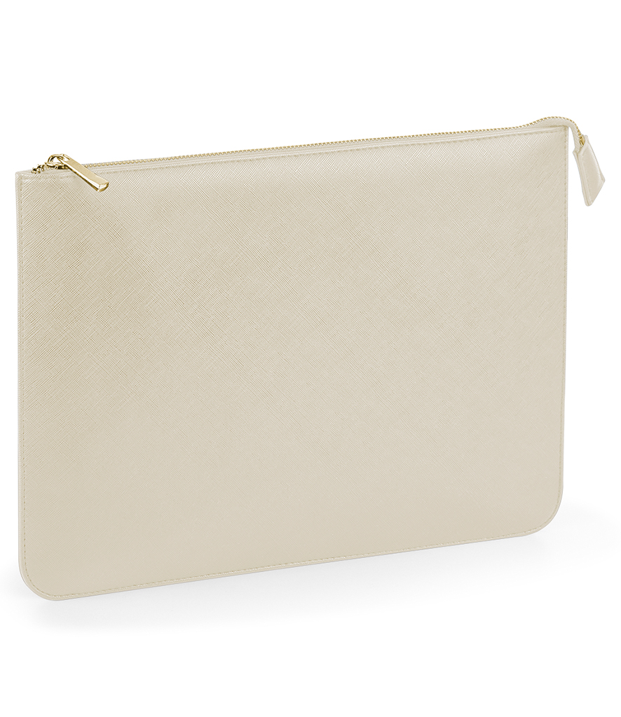 100% leather-look PU. Saffiano fine grain. Soft touch lining. High shine gold metal zip closure. Designed to fit A4 folders. Multi-purpose use. Tear out label.