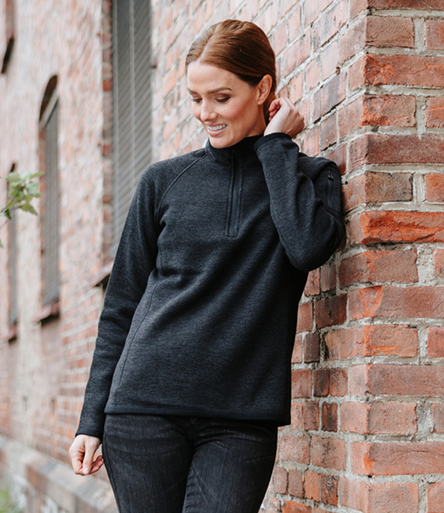 75% recycled polyester/25% polyester. Sweater knit fleece with brushed inner.Brushed tricot lined collar, cuffs and hem.Low profile zip neck.Raglan sleeves.Articulated shoulders.Left sleeve zip pocket.Self colour bound cuffs and hem.Flatlock stitched seams.