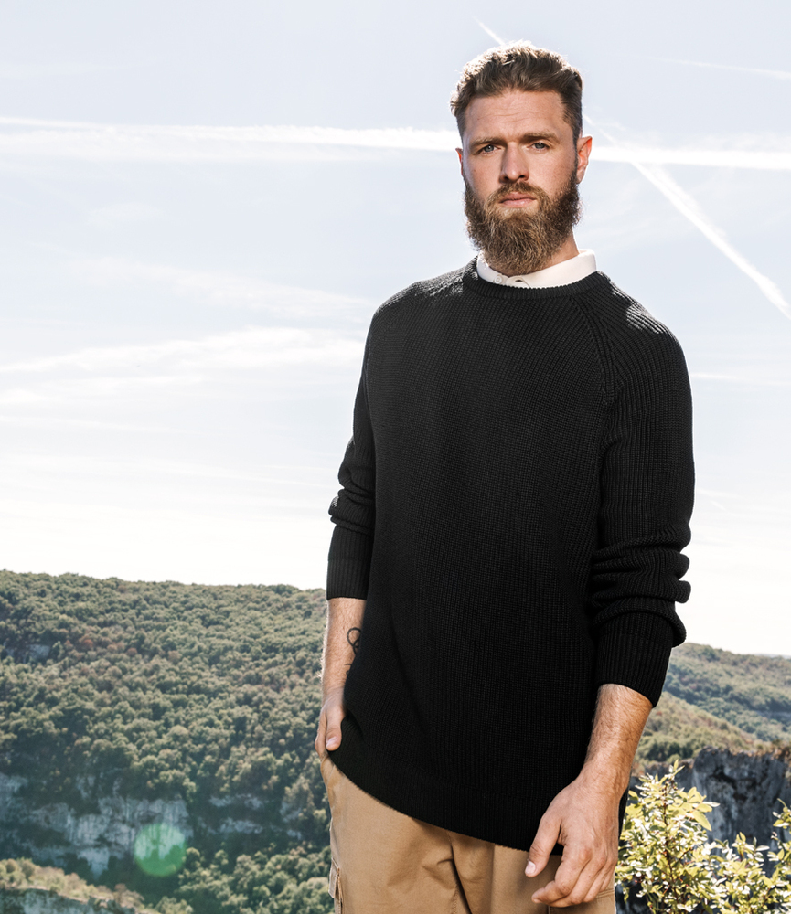 50% organic cotton/50% recycled polyester. Raglan sleeves.Fully fashioned knit.Ribbed collar, cuffs and hem.Navy blue herringbone taped neck.Personalisation patch inside neck.Tag free.Recycled polyester is made from post-consumer waste.
