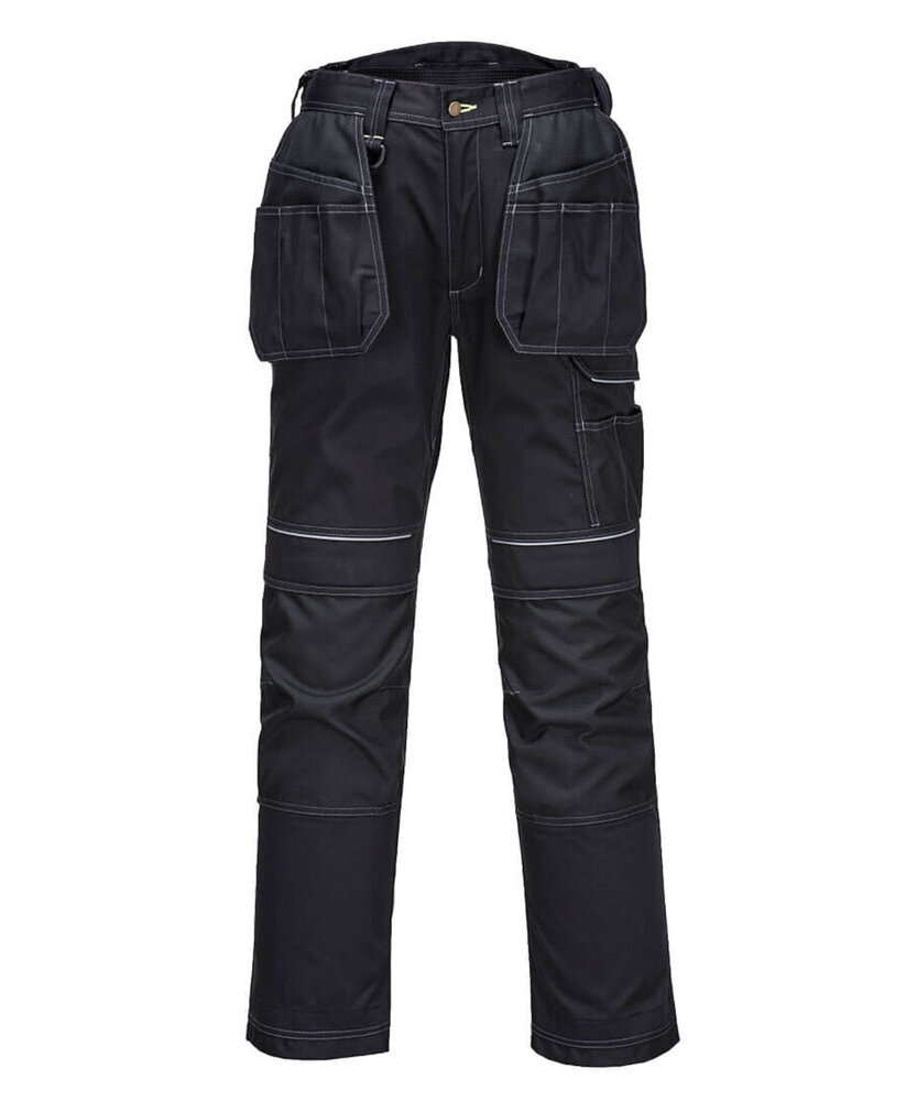Hammer loop for secure storage of work tools. Double rule pocket. Fully lined and padded to trap the heat and increase warmth. Adjustable hem to accommodate all leg lengths. Top-loading kneepad pockets for quick and easy access. Easy-access cargo pocket. Zip-off holster pockets for added versatility. Abrasion-resistant Oxford polyester.