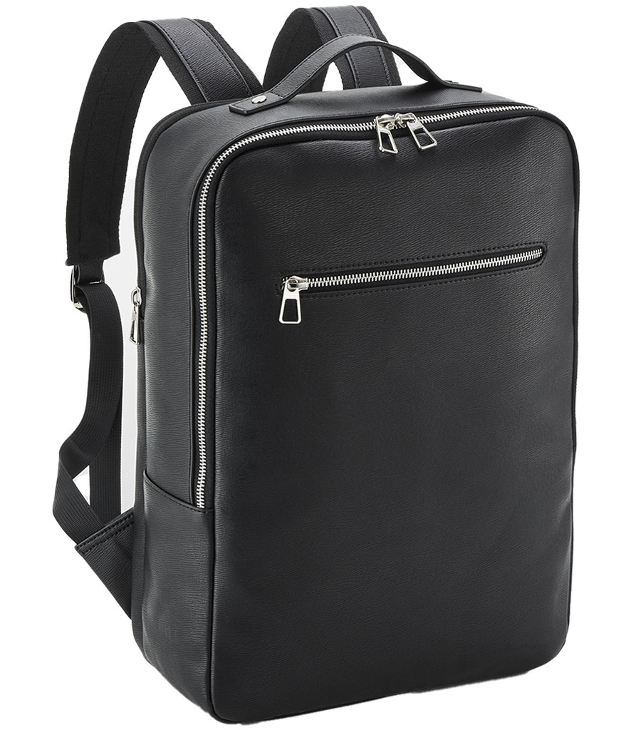 100% leather-look PU. Recycled polyester lining. Grab handle. Adjustable shoulder straps. Main compartment with two way zip. Front zip pocket. Rear padded laptop compartment, compatible up to 16". Two internal slip pockets. Internal water bottle holder. Rear luggage strap. Tear out label. Capacity 10 litres.