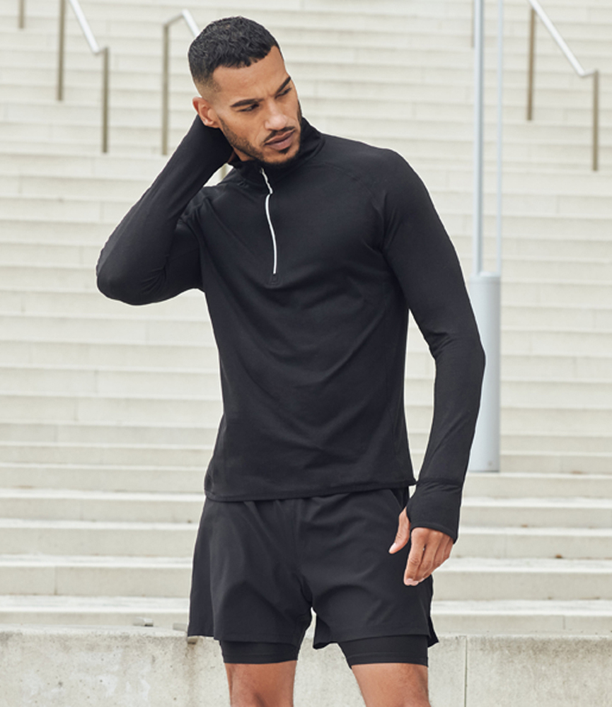 90% polyester/10% elastane. 88% polyester interlock/12% elastane under shorts. Four-way stretch microfibre short. Integrated under short with wicking properties. Elasticated waistband with inner drawcord. Two side zip pockets. Concealed media pocket on under short. Side vents. Tear out label.