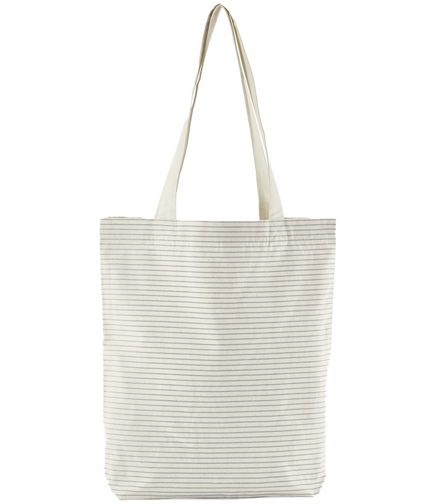 100% organic cotton. Dyed yarn. Striped design. Carry/shoulder straps (67cm long). Cut out label. Capacity 10 litres.
