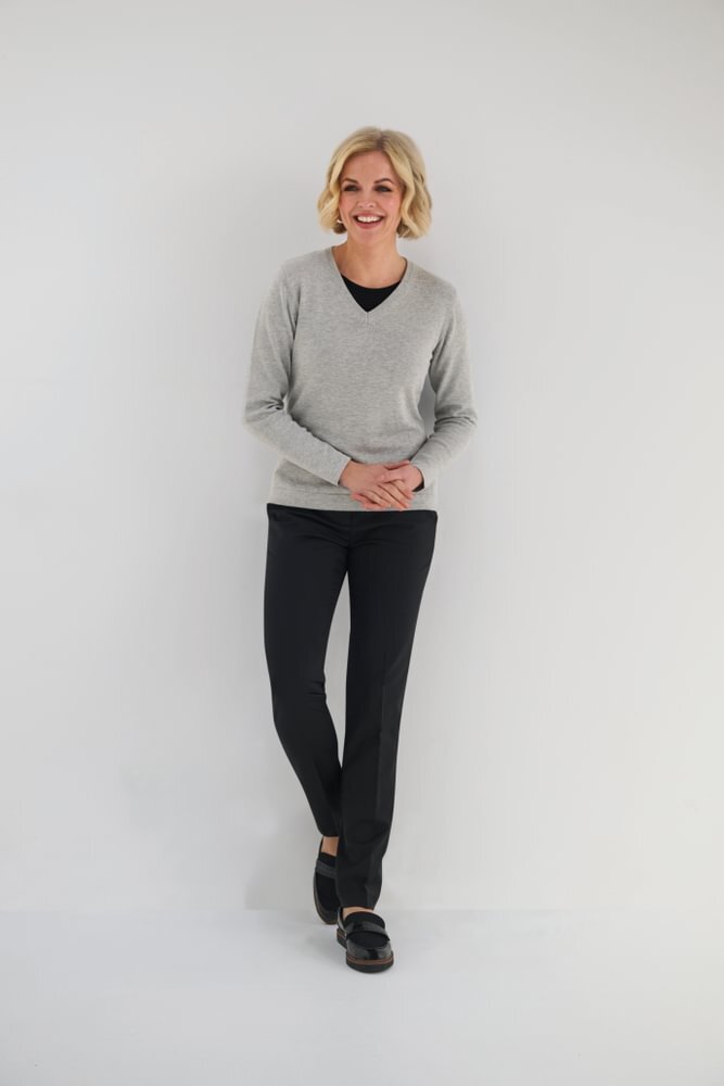 V-neck, long sleeve, ribbed neck, tubular cuff and hem, contrast inner neck strip